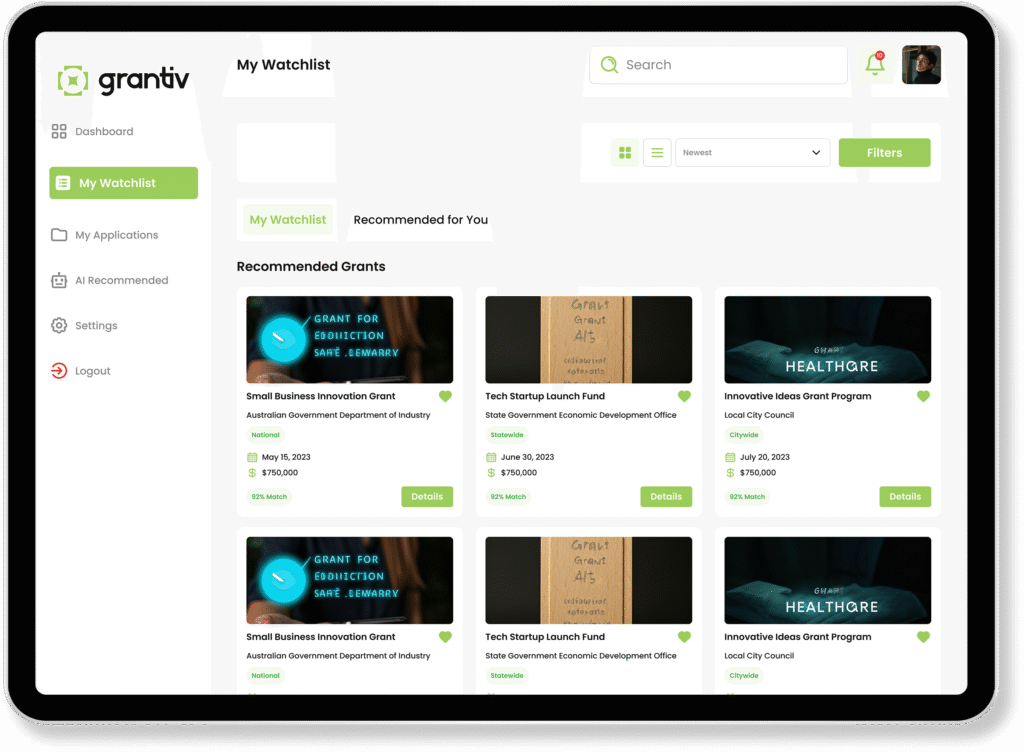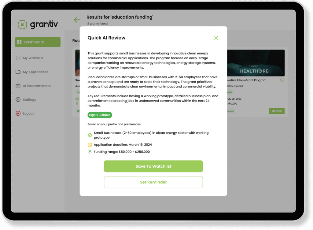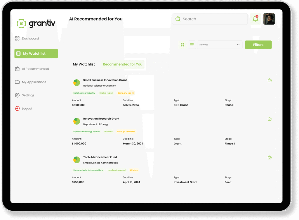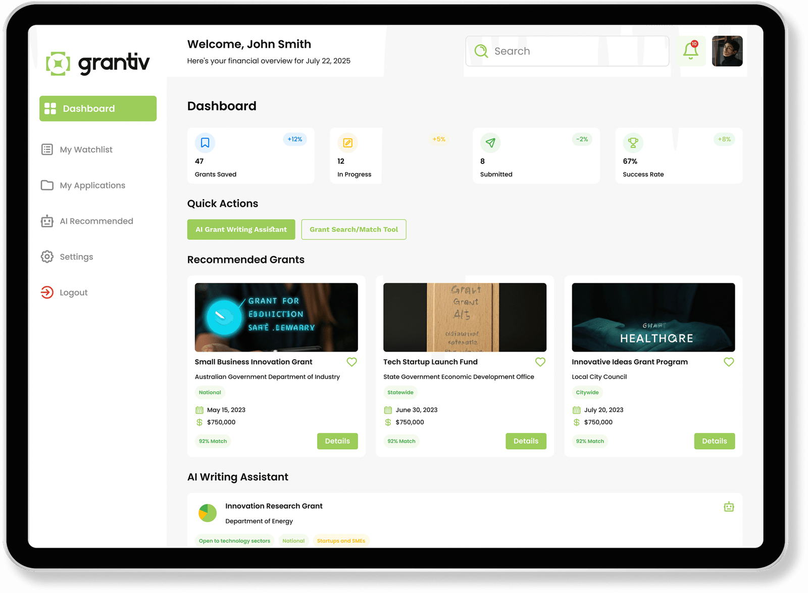 Grantiv uses AI to help you find the right grants, draft applications quickly, and track every deadline—all in one simple dashboard.